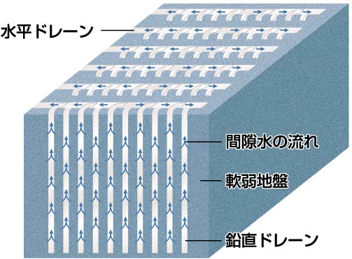 PDF工法では連結フロートを使用することで,水上・泥土を問わずに鉛直ドレーンを打設することができます。また,泥上施工においては,トラフィカビリティ確保のための固化処理,サンドマットの敷設が必要ありません。さらに水平ドレーンを組み合わせることでサンドマットの代替とすることができます。