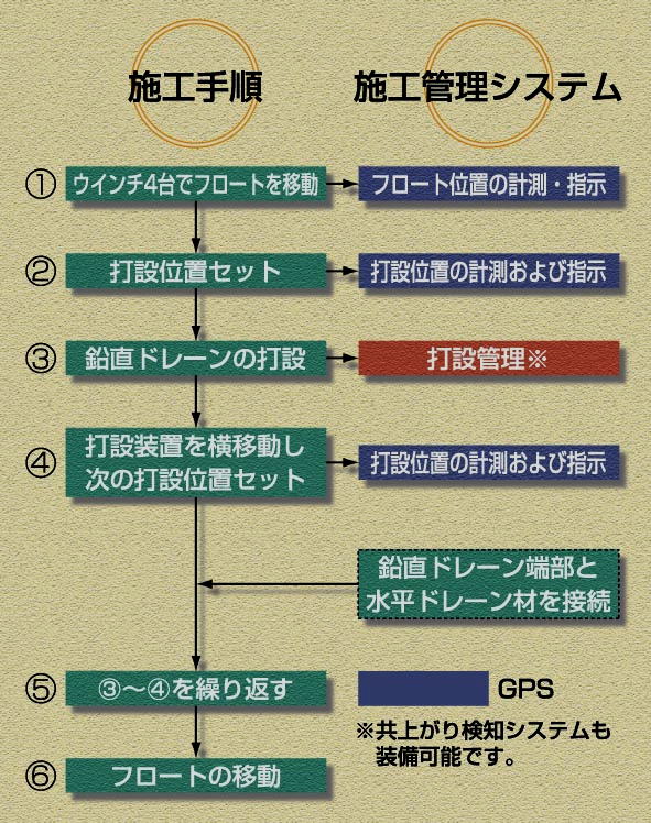PDF工法におけるドレーン材の打設は,下記の手順で行います。その際,正確かつスピーディーな施工が行えるよう専用の打設管理,位置決めシステムを塔載しています。